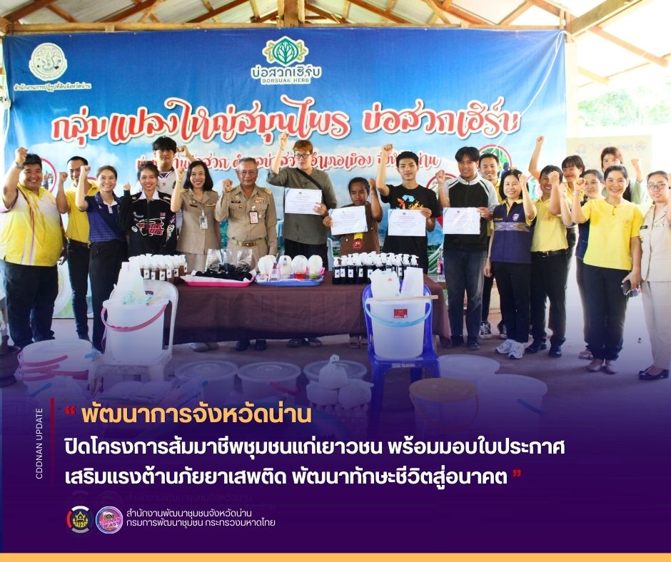 พัฒนาการจังหวัดน่าน ปิดโครงการสัมมาชีพชุมชนแก่เยาวชน พร้อมมอบใบประกาศเสริมแรงต้านภัยยาเสพติด พัฒนาทักษะชีวิตสู่อนาคต