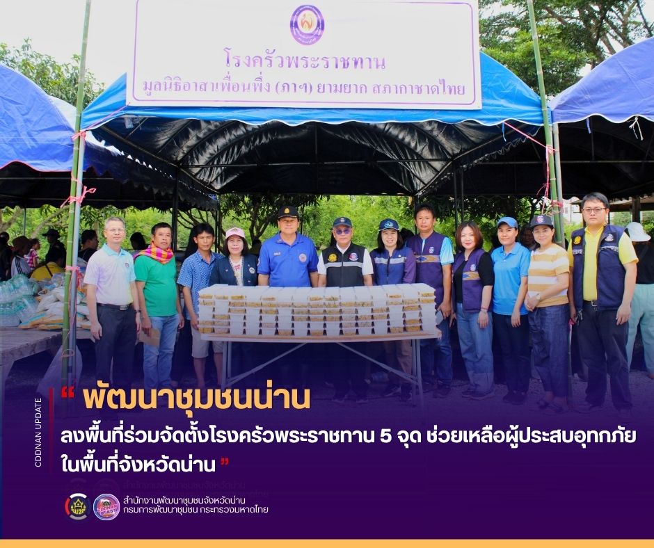 พช.น่าน ลงพื้นที่ร่วมจัดตั้งโรงครัวพระราชทาน 5 จุด ช่วยเหลือผู้ประสบอุทกภัยในพื้นที่จังหวัดน่าน