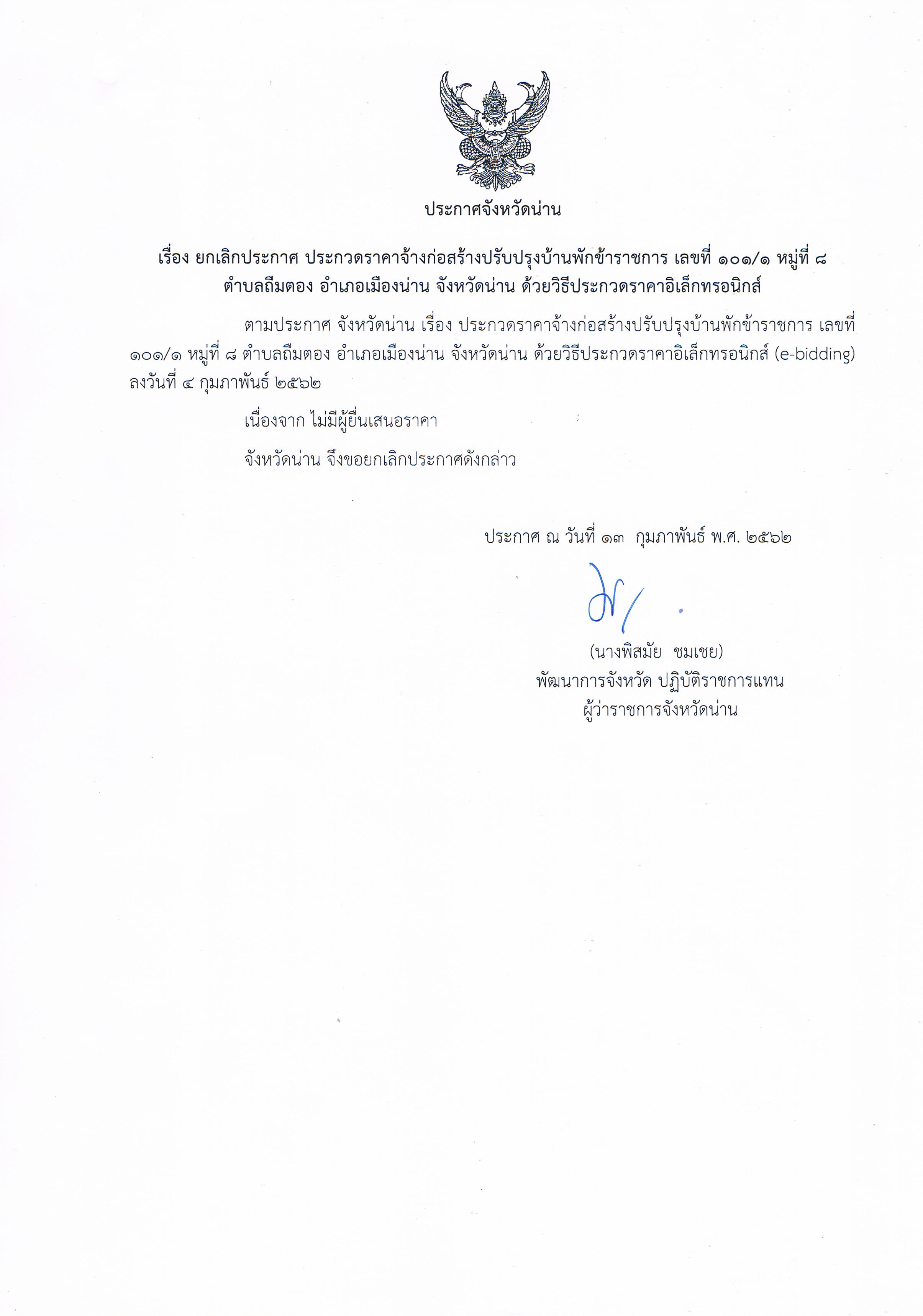 ประกาศ จ.น่าน เรื่องยกเลิกประกาศประกวดราคาจ้างก่อสร้างปรับปรุงบ้านพักข้าราชการ เลขที่ 101/1 หมู่ที่ 8 ตำบลถืมตอง อ.เมืองน่าน จ.น่าน ด้วยวิธีประกวดราคาอิเล็กทรอนิกส์