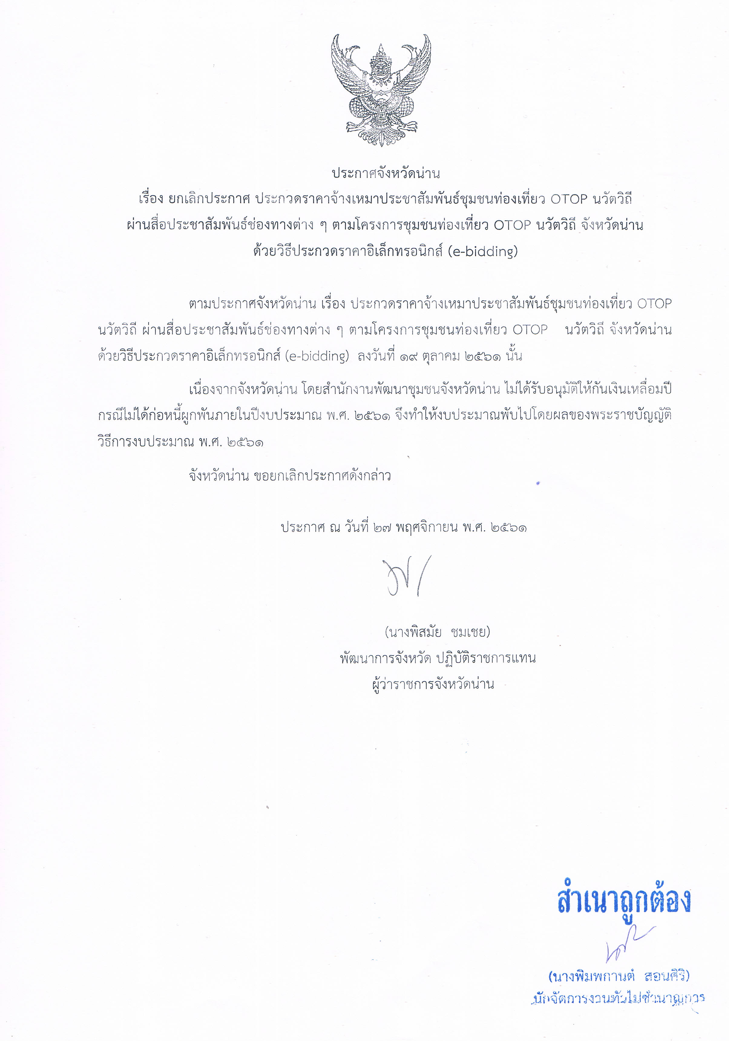 ประกาศ จ.น่าน เรื่องยกเลิกประกาศ ประกวดราคาจ้างเหมาประชาสัมพันธ์ชุมชนท่องเที่ยว OTOP นวัตวิถี ผ่านสื่อประชาสัมพันธ์ช่องทางต่าง ๆ ตามโครงการชุมชนท่องเที่ยว OTOP นวัตวิถี จ.น่าน ด้วยวิธีประกวดราคาอิเล็กทรอนิกส์ (e-bidding)