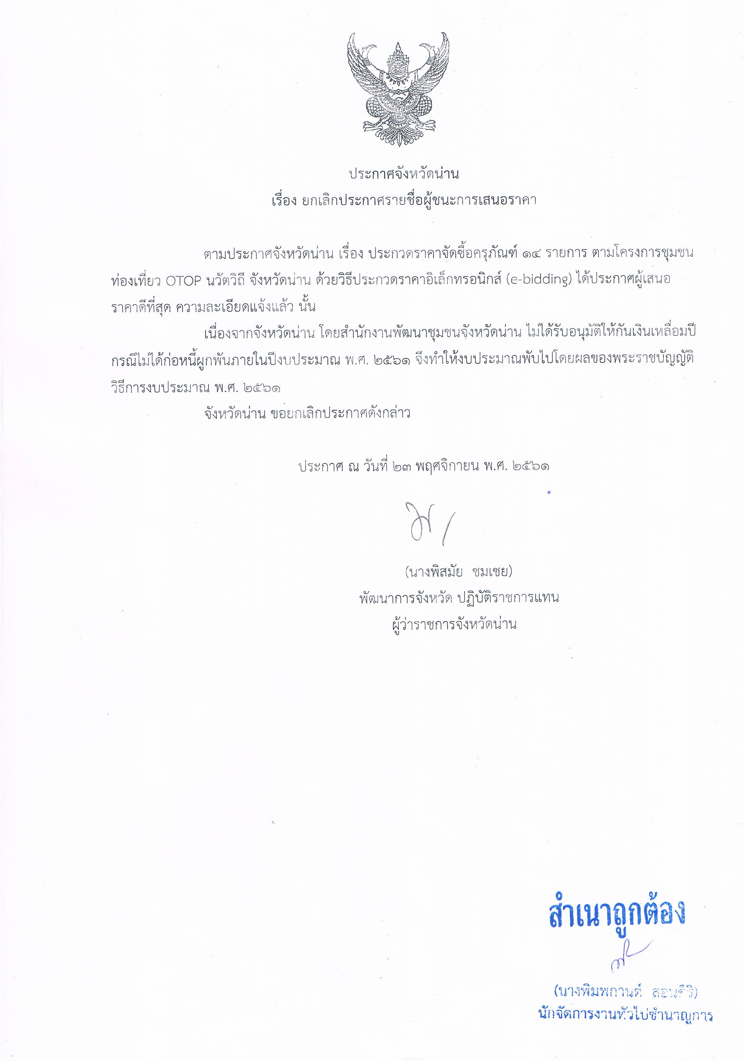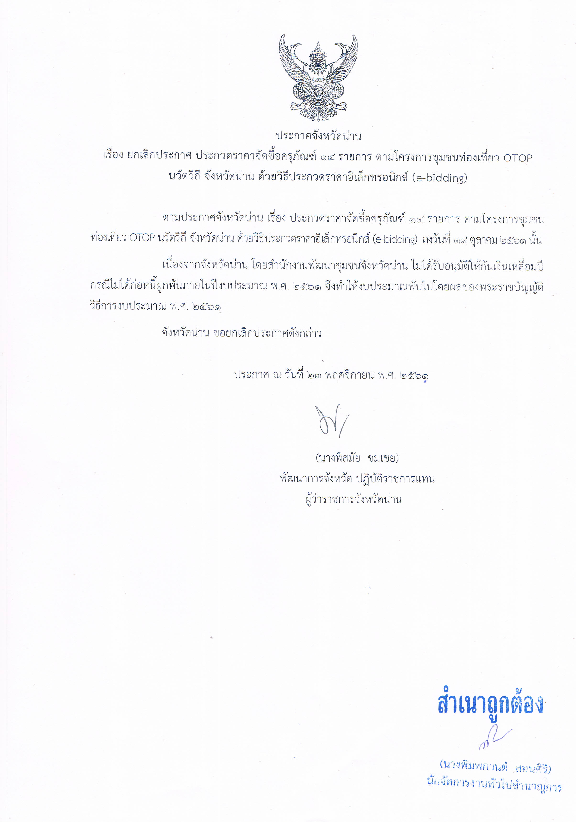 ประกาศ จ.น่าน เรื่องยกเลิกประกาศ ประกวดราคาจัดซื้อครุภัณฑ์ 14 รายการ ตามโครงการชุมชนท่องเที่ยว OTOP นวัตวิถี จ.น่าน ด้วยวิธีประกวดราคาอิเล็กทรอนิกส์ (e-bidding)